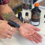 Em uma balança coloque um recipiente e tare, acrescente 940 gramas de Álcool de Cereais 94.3, logo em seguida coloque a Água Mineral  até que essa mistura pese 1kg, acrescente a Glicerina Bi-Destilada Vegetal, em seguida acrescente a essência e com a ajuda do recipiente lave o Becker da essência para aproveitar todo o líquido. Adicione o corante até atingir a tonalidade desejada. Misture com auxílio de uma espátula até ficar homogêneo. Higienize os frascos e as válvulas e complete.