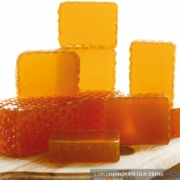 Derreta a base glicerinada solicitada no modo tradicional, retire da fonte de calor, tampe e reserve por 10 minutos. Em seguida adicione todos os materiais solicitados, misture bem para que fique homogêneo. Para colorir, coloque o corante laranja e um pouco de azul, até que fique na cor desejada. Tampe e reserve até que ela fique morna para que não derreta o favo que esta dentro da forma. Complete a forma com cuidado até a borda e reserve. Corte em fatias de no mínimo 2 centímetros.