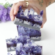 Para essa receita você deverá fazer como pré produção uma barra de pedra de ametista em um recipiente ou forma separada. Com esta base pronta comece cortando uma parte em vários cubinhos pequenos e reserve. Após isso, lapide também algumas lascas em pedaços maiores para serem as pontas da ametista.