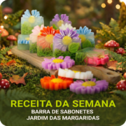 Para a montagem, despeje uma pequena quantidade da base amarela no becker e preencha apenas o centro (miolo) da forma de silicone. Aguarde alguns instantes até que comece a firmar e, em seguida, complete com a base colorida, formando a flor. Espere esfriar completamente antes de desenformar. Repita o processo para as cores que deseja produzir.