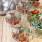 Na primeira etapa iremos preparar todos os materiais da pré-produção. Com o ralador Keita rale um pouco de base glicerinada branca para fazer o efeito da neve. Na parte que não tem o furo coloque a neve para fazer o fundo. Vá posicionando os elementos já prontos de Natal (árvore, presente, rena etc.) Lembrando que devem ser elementos de pigmento para não migrar no restante da esfera. Salpique um pouco de glitter cristal.