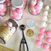 Agora despeje na bacia a metade da base que está na panela. Adicione o pigmento branco para deixar mais claro e bem branquinho. Com a ajuda do batedor de claras bata a base mas não para aerar muito, apenas para esfriá-la e deixar mais maleável! Quando ela começar a endurecer continue mexendo com a espátula e assim que ficar firme, vista as luvas e com as mãos sove a massa como uma massa de pão.  Assim que estiver cremosa, posicione um celofane sobre a bancada e com a ajuda do pegador de sorvete tire um pouco da massa, ajeite as sobras para não cair e posicione a massa sobre o celofane. Observação importante: O pegador precisa ter aquela alça que você aperta e ele gira por dentro removendo o sorvete! Só com esse que dá certo! Tire a bola de sorvete e repita o processo até acabar esta massa! Despeje o restante da base na bacia, adicione o pigmento rosa, misture bem e agora repita o mesmo processo de aerar até ficar como uma massa e faça o restante das bolas de sorvete!