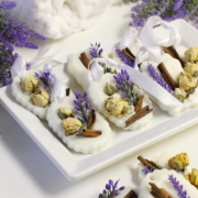 Despeje a parafina na bandeja e comece a decorar com flores, folhagens, pequenas suculentas de parafina, canela em pau e frutas desidratadas, lembrando sempre de deixar um espaço entre cada arranjo, para depois poder cortar. Para o corte você pode usar uma faca para fazer lascas ou cortadores. Importante, a parafina não pode estar totalmente fria e dura para o corte!