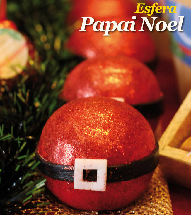 Abra as esferas e lustre uma a uma com um pano úmido. Em seguida coloque o gliter em uma bacia e passe as esferas para que fiquem brilhantes. Reserve. Agora com a placa de glicerina preta corte uma tira de 1x25cm e envolva toda a esfera pressionando para que fixe em toda a volta. Com a placa branca, corte um quadrado de 2x2cm aproximadamente, e retire o centro com a ajuda da faca para formar a fivela do cinto do Papai Noel. Pressione em cima da tira preta e esta pronto. Faça isso com todas as esferas.