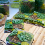 Em uma forma de madeira embrulhada de saco plástico despeje uma pequena quantidade da base glicerinada transparente na forma. Em seguida desenforme os sabonetes das formas de silicone e preencha uma camada com esses sabonetes intercalando e todos virados para baixo. Acrescente uma camada fina e espere formar uma película. A receita chama tridimensional porque agora você vai colocar uma camada transparente e continuar posicionando as folhas e o arabesco e acrescentar mais base transparente e colocar mais folhas para criar o efeito 3D, repita esse processo umas três ou 4 vezes. Deixando espaço para a última camada