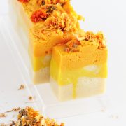 Prepare a forma e despeje na bacia 1/3 da base preparada, bata com o fuet, faça espuma e misture até começar a engrossar e despeje na forma, despeje mais 1/3 da base na bacia, adicione pigmento amarelo misture para esfriar um pouco e no ponto de mingau líquido despeje na forma, com a ajuda da espátula fure a camada de baixo e misture um pouco as duas bases. Em seguida despeje o restante da base na bacia, adicione 2 gotas de pigmento vermelho e bastante pigmento amarelo até ficar bem laranja, bata com o fuet até fazer bastante espuma misture com a espátula e no ponto de mouse despeje na forma, misture as camadas com a espátula para que cole as etapas e por fim posicione duas flores de calêndula em cima de cada pedaço que vai ser cortado! Ufa pronto! Agora que te ensinei bora lá separar os ingredientes e fazer o seu super sabonete!