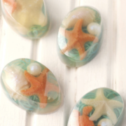 Com o auxílio da espátula, confira se está tudo derretido. Acrescente a essência solicitada para a 1° etapa, misture bem e divida em quatro partes, em cada parte acrescente uma cor de pigmento e despeje cada parte em um tipo de forma de silicone correspondente ao elemento, como estrela do mar, tartaruga, cavalo marinho, pérolas ou conchas e espere secar. Com o restante da base azul preencha uma forma quadrada, espere a barra solidificar, faça fios de sabonetes e reserve.