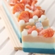 Assim que todos os sabonetes estiverem sólidos, desenforme-os, dê leve pinceladas com amido de milho e faça os detalhes dos sabonetes com os pigmentos especificados para cada cor, por fim, inicia-se a montagem.