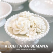Assim que você tiver as flores já desenformadas e prontas iniciaremos o processo da montagem. Derreta 250g de parafina de soja e 250g de gordura vegetal, espere esfriar e quando estiver abaixo de 60° acrescente 50 ml de essência para velas White Jasmim  Candle. Para chegar à textura ideal dessa vela é necessário que você fique mexendo o conteúdo da panela para que ela esfrie e adquira uma textura de massa. Quando chegar nessa textura mais grossa você vai completar as bases do porta velas de cerâmica, coloque a massa nos dois suportes e quanto mais grossa ela estiver, mais alto ficará o centro do seu porta velas.