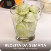 Agora despeje na bacia a metade da base que está na panela. Adicione o corante amarelo e um pouco de laranja para deixar mais próximo a cor verde desejada. Com a ajuda do batedor de claras (fuet) bata a base mas não para aerar muito, apenas para esfriá-la e deixar mais maleável! Quando ela começar a ficar mais fria coloque a fragrância. Sugestão importante, coloque um pouco de aveia para parecer com as cascas do pistache. Quando ela começar a endurecer continue mexendo com a espátula para que ficar firme. Assim que estiver cremosa, posicione a bacia sobre a bancada e use a espátula para raspar as para não cair e posicione a massa sobre o celofane. Observação importante: O pegador precisa ter aquela alça que você aperta e ele gira por dentro removendo o sorvete! Só com esse que dá certo! Tire a bola de sorvete e repita o processo até acabar esta massa e fazer várias bolinhas de sorvete de pistache.